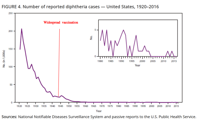 Grafiken, wie diese hier mit der Entwicklung der Anzahl der Diphtheriefälle in den USA, sagen schon alles und sind nicht mal kontrovers. Für fast jeder andereErkrankung, gegen die in den gängigen Impfprogrammen geimpft wird, lassen sich ähnliche offizielle Daten finden.